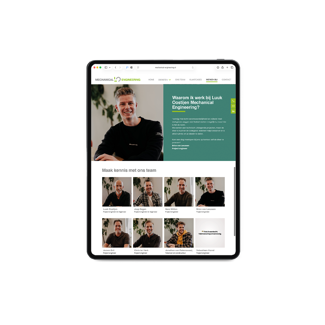 Daarna hebben we de website opnieuw ingericht met een duidelijke structuur, sterke call to actions en teksten die laten zien wie Luuk Oostijen Mechanical Engineering is als werkgever. Een belangrijk onderdeel was het toevoegen van een uitgebreid Werken bij gedeelte. Hier krijgen potentiële collega’s een eerlijk en herkenbaar beeld van het team, de manier van werken en de projecten.